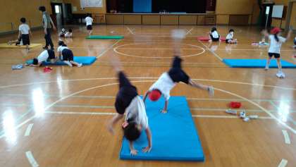 体育館でマット遊びをしています。マットを川に見立てて、いろいろな飛び越えかたをしています。側転のような動作で越える児童もいます。