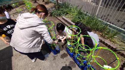 アサガオの観察をしています。自分の植木鉢と学習園で育てています。植木鉢の方は双葉から本葉が出てきています。