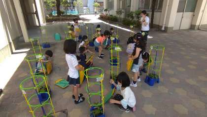 アサガオの観察をしています。体育館の軒下にそれぞれの植木鉢を運んで観察しています。ワークシートにアサガオの葉っぱの絵をかいています。