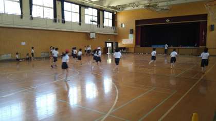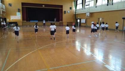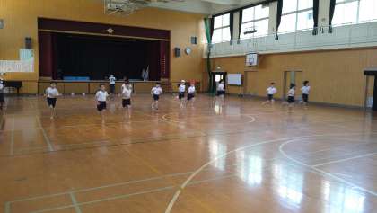 体育館で新体力テストの20mシャトルランを計測しています。運動場では日差しが強く、気温も高いので体育館で実施しています。最高記録は95回でした。