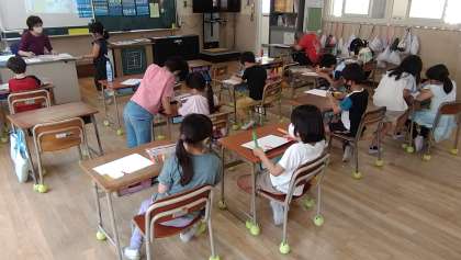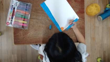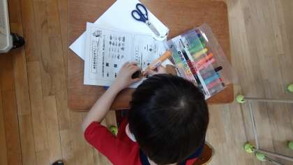 おもちゃ作りをしています。今回は「じしゃくのめいろ」です。動かすコマは自分で考えたものや好きなキャラクターにしています。それに合わせた迷路をマジックを使って作っています。