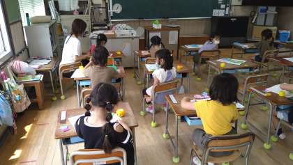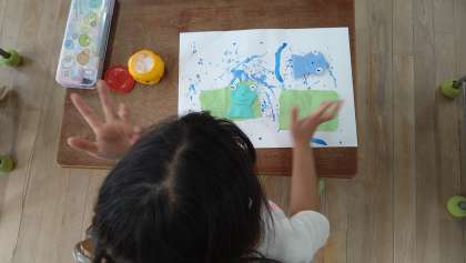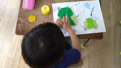 これまでに制作した折り紙のカエルと色画用紙の葉っぱを台紙に貼っています。台紙は絵の具(水が多め)をストローで吹いて雨に見立てたものです。