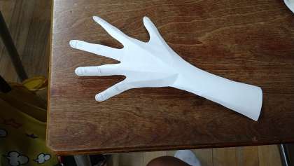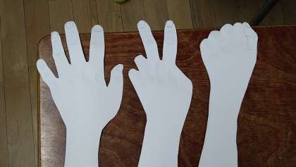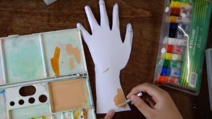 利き手の反対の手(腕)をデッサンし、切り取って着色しています。肌の色を作り出すことに苦戦している児童もいます。手の腱に当たるところを画用紙を折って立体的に表現している児童も数名います。