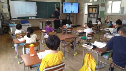 「かたかなで書くことば」について考えています。みんなが思いついたかたかなが地名や人の名前、外国からきたことば、ものの音や動物の鳴き声のどれに当てはまるかを考えています。