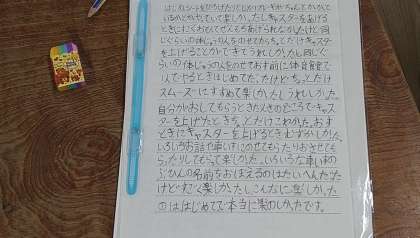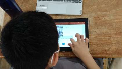 以前実施した車いす体験のまとめをしています。タブレット端末の中に入っているパワーポイントを使っています。パワーポイントは初めてではないので1人でできることも少しずつ増えてきています。