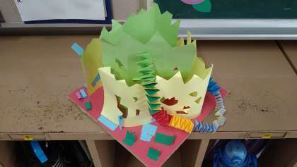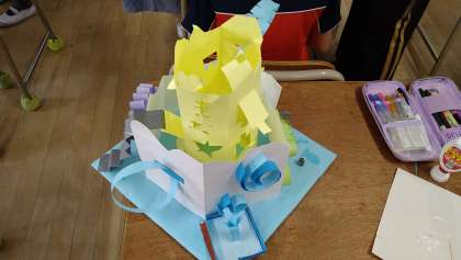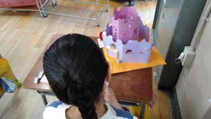 「夢の城へようこそ」の最後の制作時間です。完成した作品は、名札を付けて、後ろのロッカーの上に置いていきます。予定より少し時間がかかりましたが、大作が揃いました。