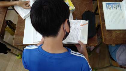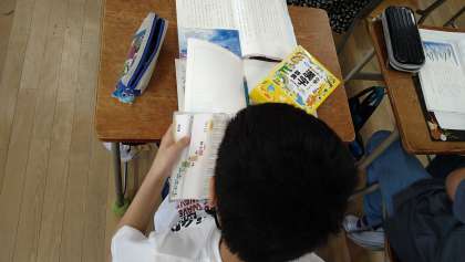 物語文「風切るつばさ」の第1時です。先生の範読を聞いた後、言葉の意味を国語辞典を使って調べています。意味調べが終わった児童から物語の設定を考えています。