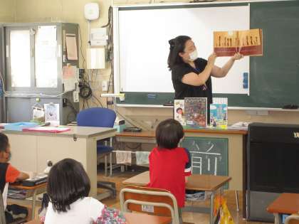 学校図書館補助員の松下さんに、読書感想文コンクールの課題図書4冊を各学級で順番に紹介していただいています。
