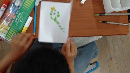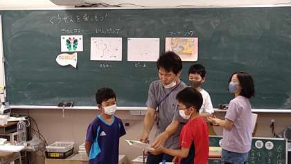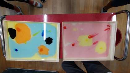 「ぐうぜんを楽しもう」ということでデカルコマニーやドリッピング、マーブリングなどの技法を使って作品づくりを楽しんでいます。偶然にきれいな作品がどんどんできています。