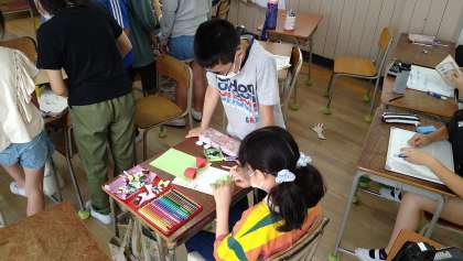 係活動をしています。さすが6年生です。それぞれの係がそれぞれの役割を考えて活動できています。学級のイベントに向けて取り組んだり、後ろの黒板を活用した常設掲示を作成したりしています。