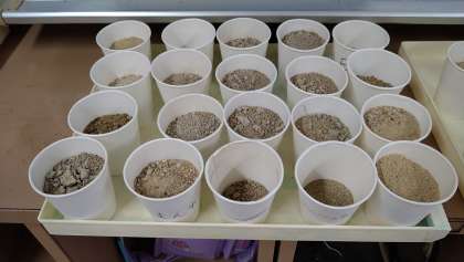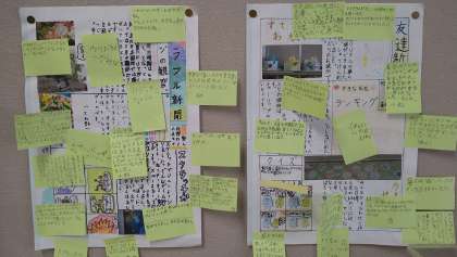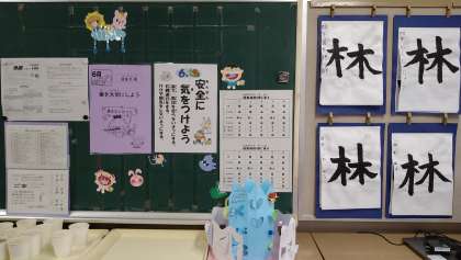 教室の後ろの黒板付近の様子です。習字やグループで作成した新聞などが掲示されたり、理科の観察物が置かれたりしています。