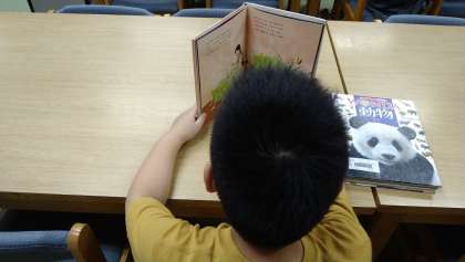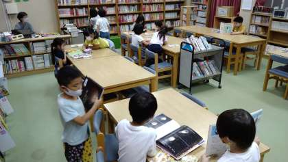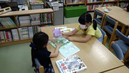 本を借りる際は、児童のバーコードを読み取ったあと、本のバーコードを読み取ります。借りる本が決まると読みたい本を選んで読んでいます、