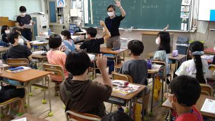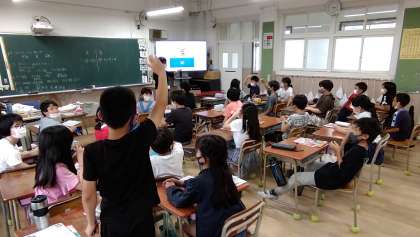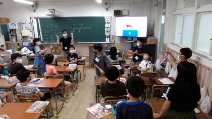 今日はC-NETのスヌーキー先生が玉津中学校から来られる日です。教科の名前を「ロック・シザーズ・ペーパー」(じゃんけん)をして勝ったチームが答えています。問題の難易度によって得点が違います。左右どちらのチームが勝ったでしょうか。