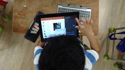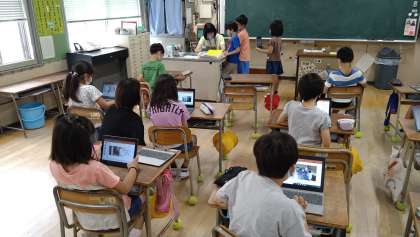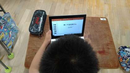 車いす体験のまとめをしています。多くの子どもたちは「車椅子介助体験」をまとめています。完成して保存したら、「車椅子自走体験」をまとめ始めています。パワーポイントにも慣れてきたようです。