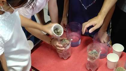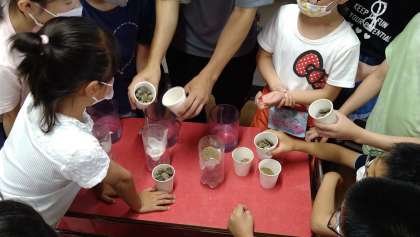 「地面を流れる水のゆくえ」を学習しています。今日は土の種類と水のしみ込み方の比較実験をしています。