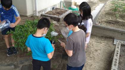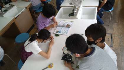 体育館付近の植物で蒸散の観察をしています。葉が付いているところと枝だけのところにビニール袋をかぶせて違いを観察しています。理科室では、持ち帰ったはを薄くちぎって顕微鏡を使って気孔を観察しています。