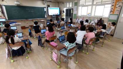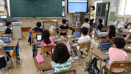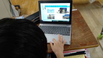 「はりねずみと金か」を学習しています。指導者が一読した後、タブレット端末を使って読書へのアニマシオン(読書が好きになるよう導くためのメソッド)として挿絵の並べ替えをしています。