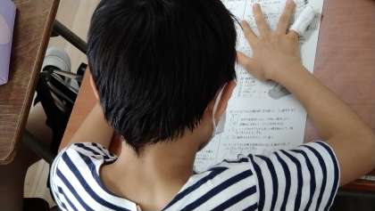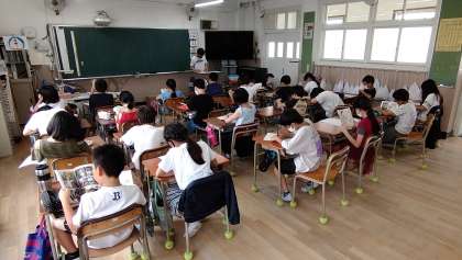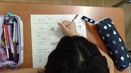 「メダカのたんじょう」の単元テストをしています。観察で使用した解剖顕微鏡の使い方やたまごの育ち方などの問に答えています。静かに集中して取り組んでいます。