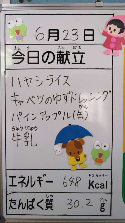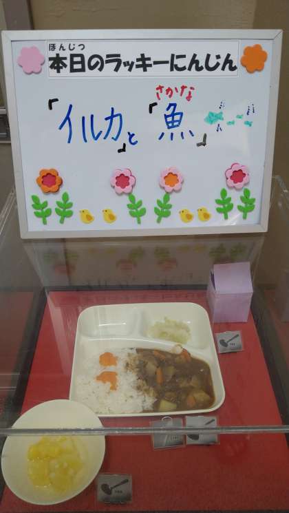 今日のハヤシライスには2種類の動物が入っていました。魚とイルカです。(ただし、2種類の型でくり抜いたニンジンです。)
