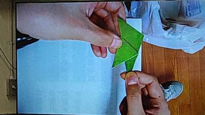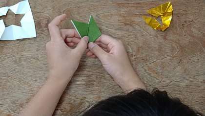 七夕の飾りを作っています。折紙で星を2つと笹の葉を作っています。星は金色で笹は深緑色です。笹の葉は少し難しいようです。次回、残り2枚の葉を作ります。