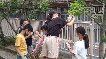 明日の実験に向けて準備をしています。植物の葉にでんぷんが含まれているかどうかを調べる実験です。今日は、葉(3枚)をアルミニウムはくで包み、日光を遮断しています。明日の朝、1枚はすぐに実験し、残り2枚は日光を当てるものと当てないものに分けて4〜5時間後に実験します。