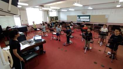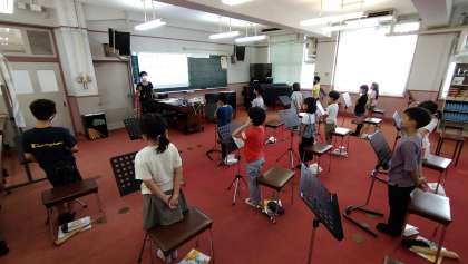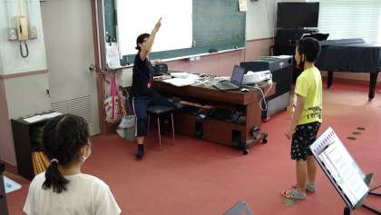 今日は「この山光る」の歌のテストをしています。普段はマスクをしたまま歌っていますが、テストは周囲との距離がとれるので、マスクを外して歌っています。とてもきれいな声で歌えています。