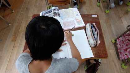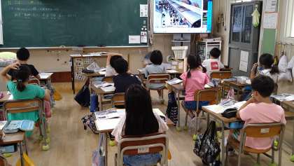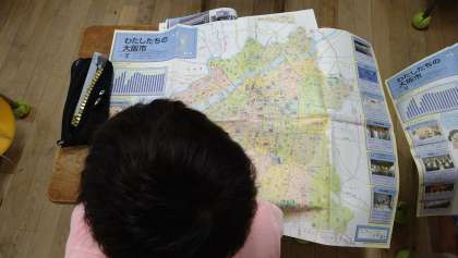 「交通について調べよう」をめあてに学習しています。JR大阪環状線が大阪市内を一周していること、さまざまな私鉄・大阪メトロが網の目のように張り巡らされていることを地図を見て確認しています。