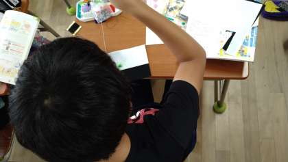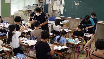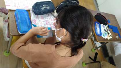 小物作りをしています。初めの作品は、全員ペンケースです。まつり縫いで周りを細かく縫えている児童もいます。ペンケースを作り終えた児童は小銭入れなどを作っています。