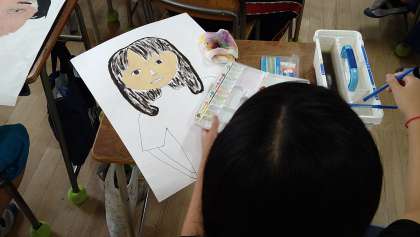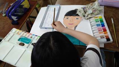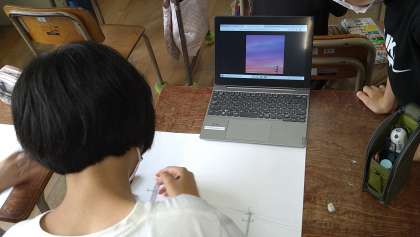 自画像の完成に向けてがんばっています。仕上がった人は「絵で時空旅行をしよう」を始めています。タブレット端末を使って、行ってみたい時代や場所を探して画用紙にかきます。