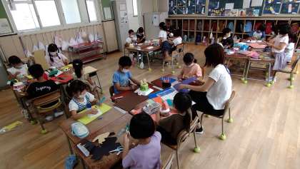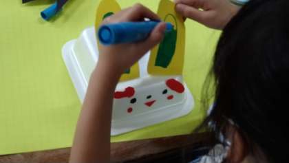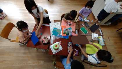 「ふわふわゴー」という単元です。家庭でご準備いただいた発泡スチロールの容器を使って作品づくりをしています。作品が完成したらうちわであおいで、風の力で動かします。