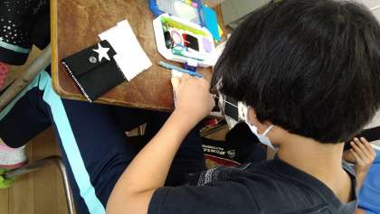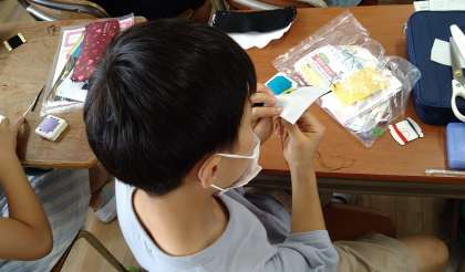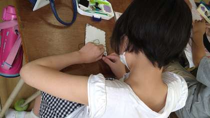 小物作りをしています。1つ目のペンケース(指定作品)はおよそ半数の児童が作成中です。ペンケースを仕上げた児童は2つ目、3つ目の作品を作成しています。