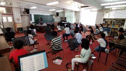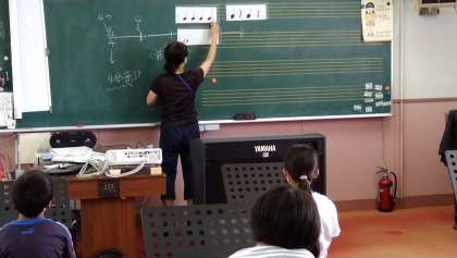 音符について学習しています。全音符が元となって、2分音符、4分音符、8分音符ができていることから、手拍子を打ってリズムを確認しています。