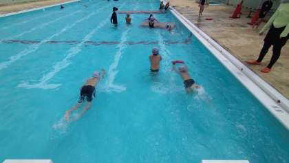 屋上プールで水泳の学習をしています。練習している泳法は、自由形(クロール)です。2つのグループに分けて練習しています。