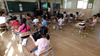 東小橋小学校の1年生も、ついにタブレット端末を使い始めました。一昨日に初めてタブレット端末に触れ、今日は2回目の活動です。運動場・廊下など教室を出て、カメラ機能を使って撮影・保存のやり方を学習します。