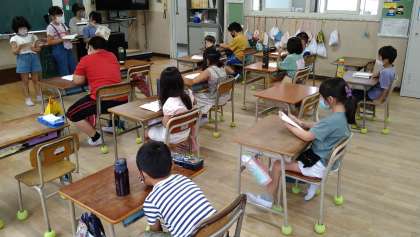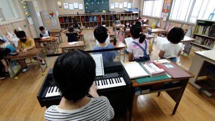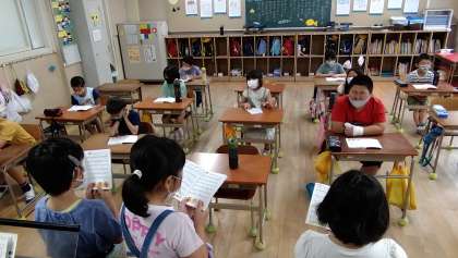 朝の会の中でイベント係が前に出て、「たのしいポケット歌集」に載っている「にんげんっていいな」を元気な声で歌っています。