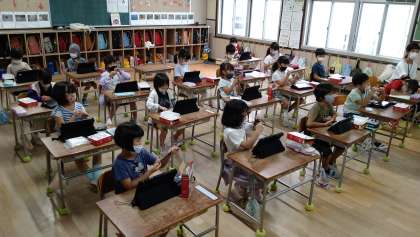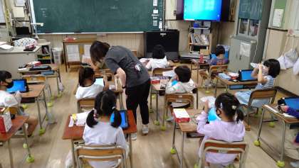 タブレット端末を使ってオンライン学習をおこなうための準備をしています。1年生は本日、タブレット端末を各家庭に持ち帰って接続テストをおこないます。