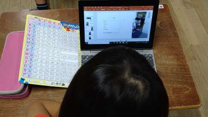 タブレット端末のパワーポイントを使い、写真入りのまとめを作成しています。