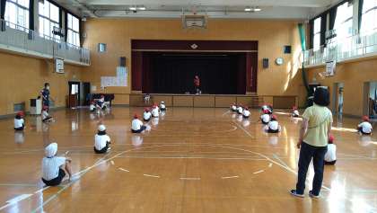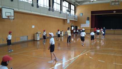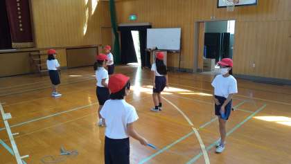 3・4年の子どもたちは、体育館で団体演技の練習を始めています。短なわを使った演技になるようです。