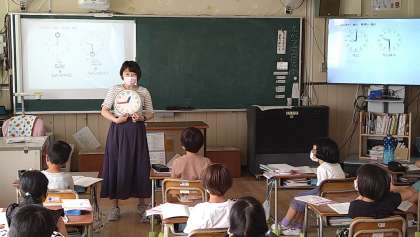 時計の模型を使って学習を進めています。短針の位置に気をつけて読んだり、模型を動かしたりしています。