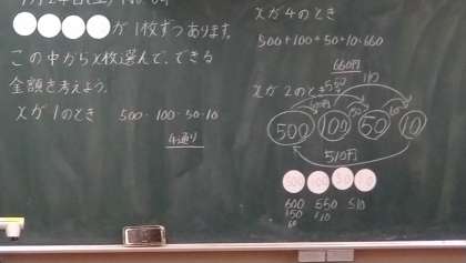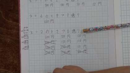 今日は4種類の硬貨(500・100・50・10)を使った問題です。1種類、4種類、2種類と使う枚数を変えた時に何通りの組み合わせがあるかを考えています。
