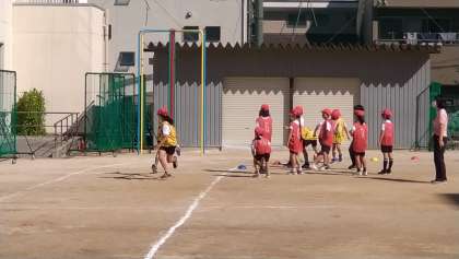 2学年合同で団体競技の「紅白リレー」の練習をしました。