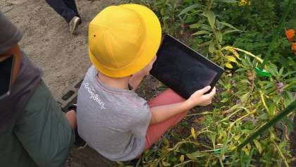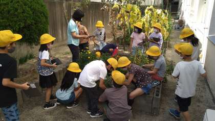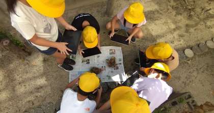 学習園で育てている「ヒマワリ・ホウセンカ・マリーゴールド」を観察しています。観察に行く前に教室でどんな状態になっているかを予想しました。観察には、タブレット端末を持って行き、様子を撮影しました。