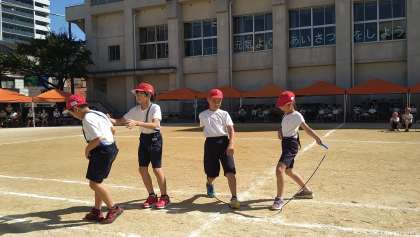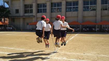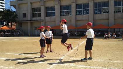 3・4年による「やってみよう」です。なわを使った団体演技です。