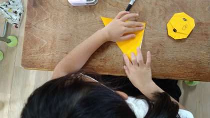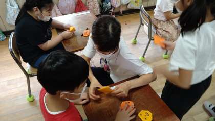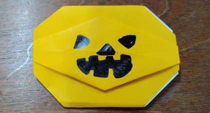 折り紙でカボチャを作って顔をかいています。