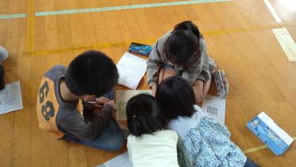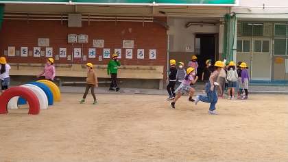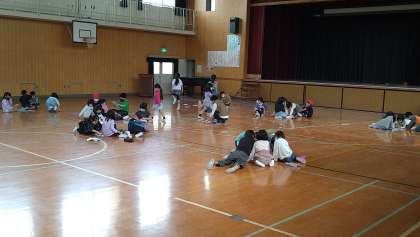 2年生が1年生をひっぱって話し合いをしています。話し合いが終わったら班の仲を深めるために運動場で遊んでいます。