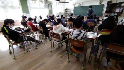 劇のシナリオを配り、読み合わせをしています。さらに劇をするにあたって、参考になる文章を担任が読んでいます。