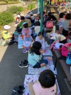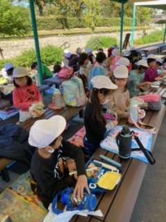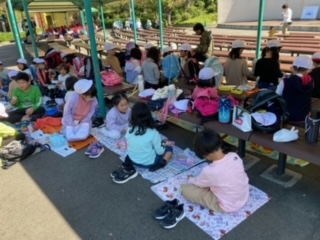 楽しみにしていたお弁当タイムです。レジャーシートがいいという子どももいて、好きなスタイルで食べています。