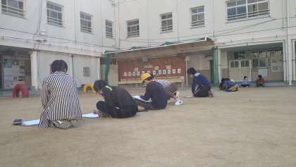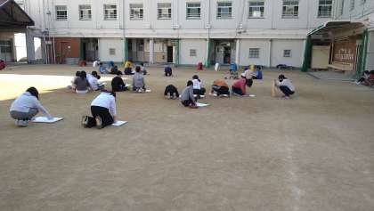 運動場に出て、校舎の絵をかいています。校舎についている時計からかき始めることが条件となっています。