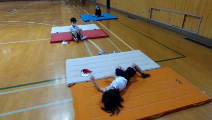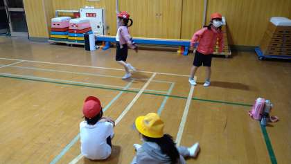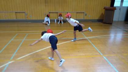 4つの運動の場をローテーションをしています。同じグループで1年生なりに見合い、教え合いをしています。