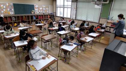黒板に楽しかったことをいっぱい思い出してから画用紙にかき始めました。